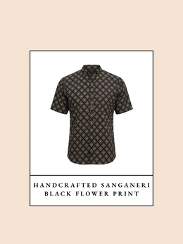Handcrafted Sanganeri Black Flower Print Half-Sleeve Shirt Mandarin Collar - Pure Cotton